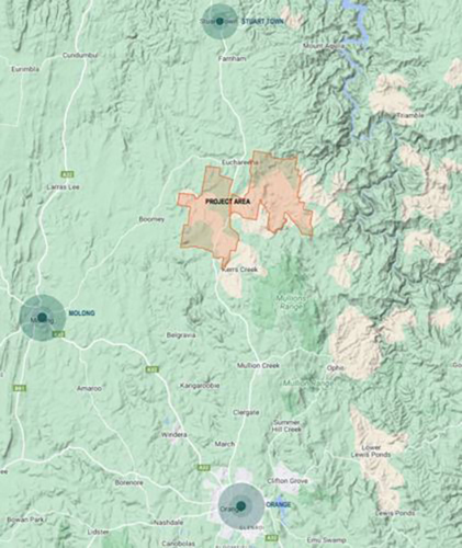 The project site is located approximately 26 km north of Orange between the communities of Kerrs Creek and Euchareena in the Dubbo Local Government Area and the Federal Electorate of Calare.