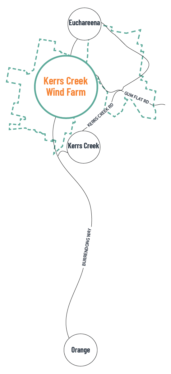 Kerrs Creek Wind Farm is located between the communities of Kerrs Creek and Euchareena in the Dubbo Local Government Area, on the lands of the Wiradjuri People.